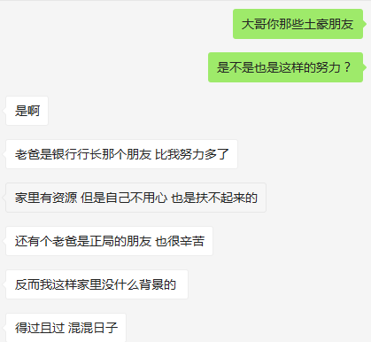 - 越厉害的人越拼,因为他周围都是这样的人,深知实现精神自由的前提是财务自由和迁徙自由;越不上进的人越懒,因为当一个井底之蛙,大家你看看我,我看看你,都差不多,就觉得日子过的蛮好的。所以这个世界的真相,有时候蛮残酷却也蛮励志的:无论中外,原来那么多比你有钱的人,一代一代的,都还比你努力啊。